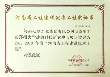 集團公司承建的“鄭州大學建筑科技研究中心項目”在此次表彰中,被授予2017-2018年度“河南省工程建設優質工程”榮譽稱號。