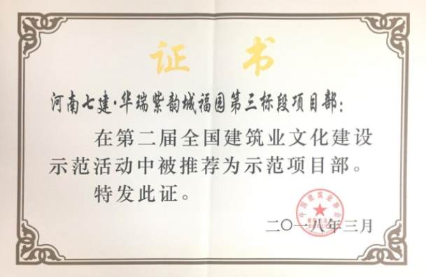 河南七建項目部榮獲全國建筑業文化建設示范項目部
