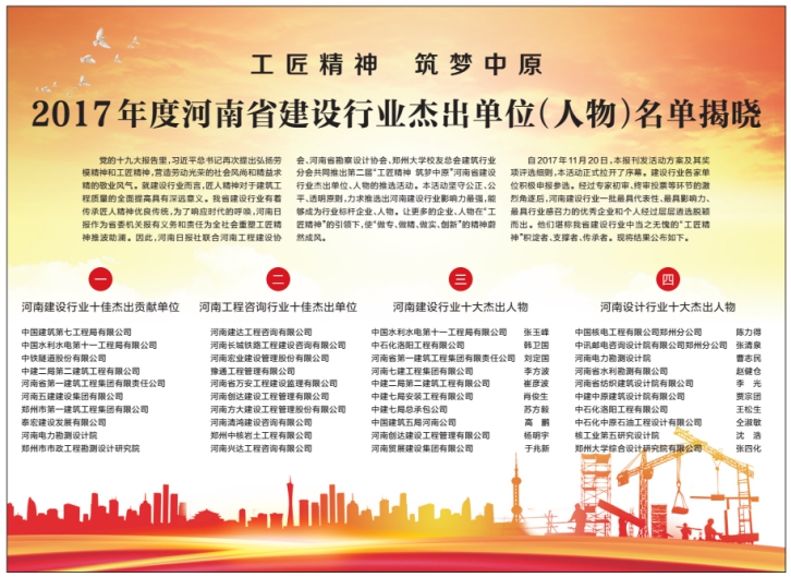 近日,《河南日報》公布了第二屆“工匠精神筑夢中原”河南省建設行業杰出單位、人物評選結果,集團公司董事長李方波獲得了 “河南省建設行業十大杰出人物”稱號。
