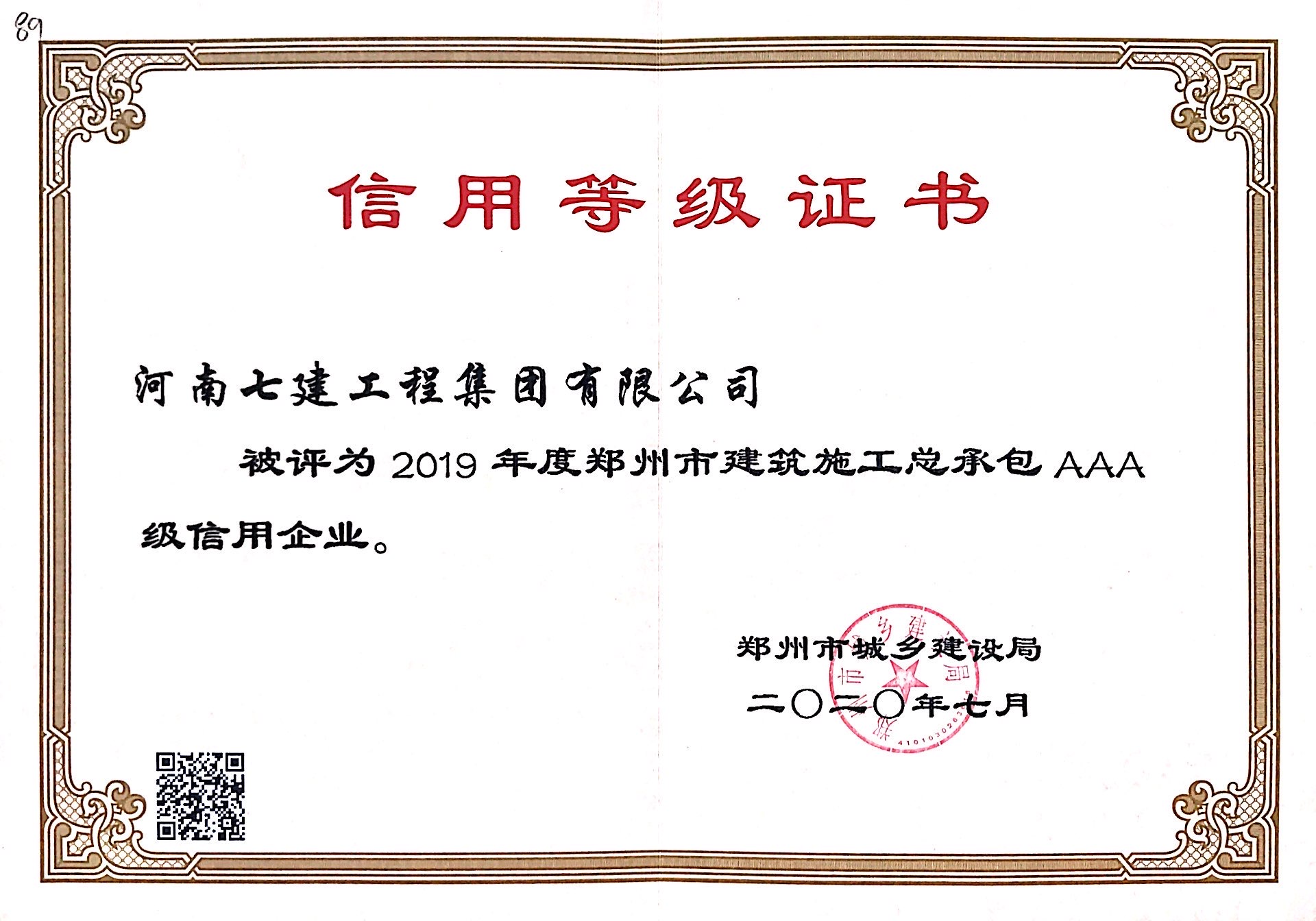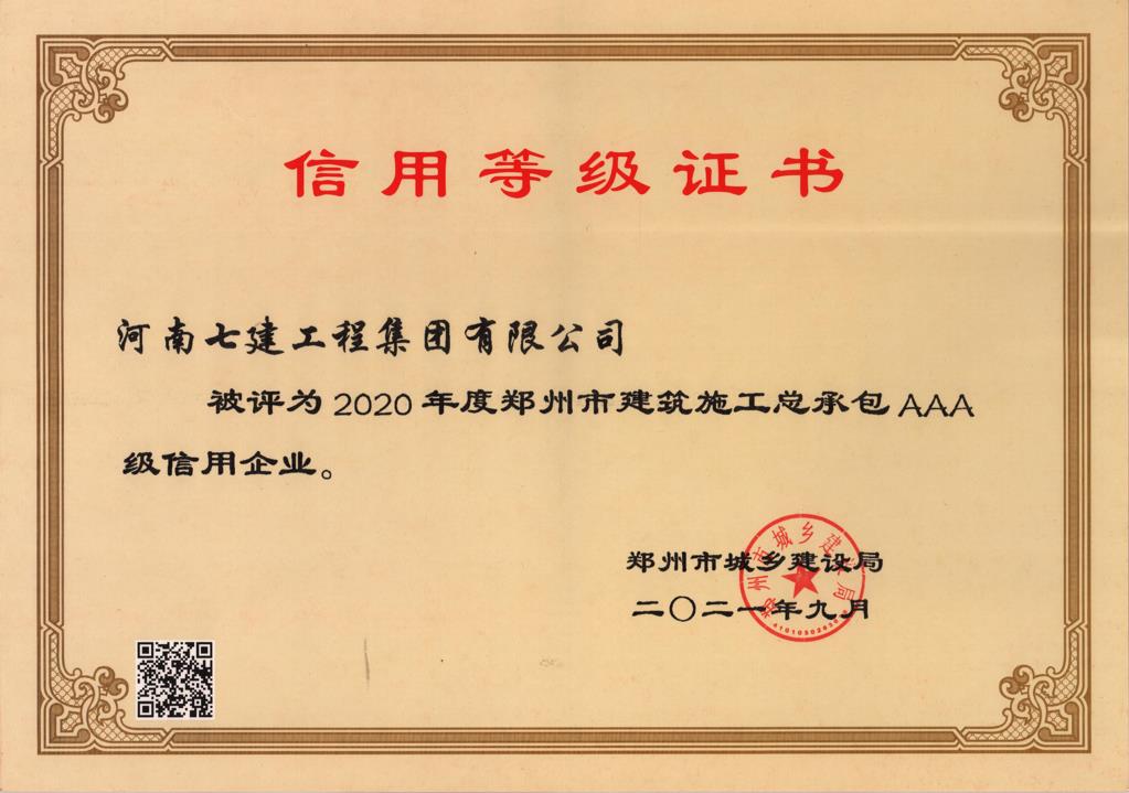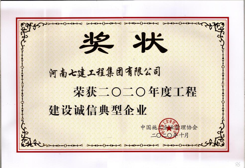 2020年度集團榮獲鄭州市施工總